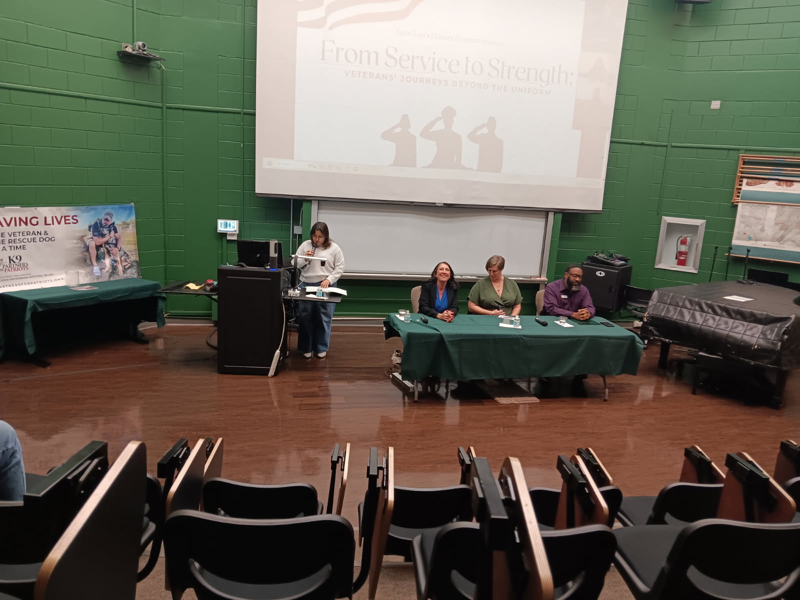 As part of Saint Leo University’s celebration of Veterans Appreciation Month, the Honors Program featured a panel titled “From Service to Strength: Veterans’ Journeys Beyond the Uniform” on Nov. 13. It took place in Selby Auditorium. The event boasted three faculty members of Saint Leo who are veterans.