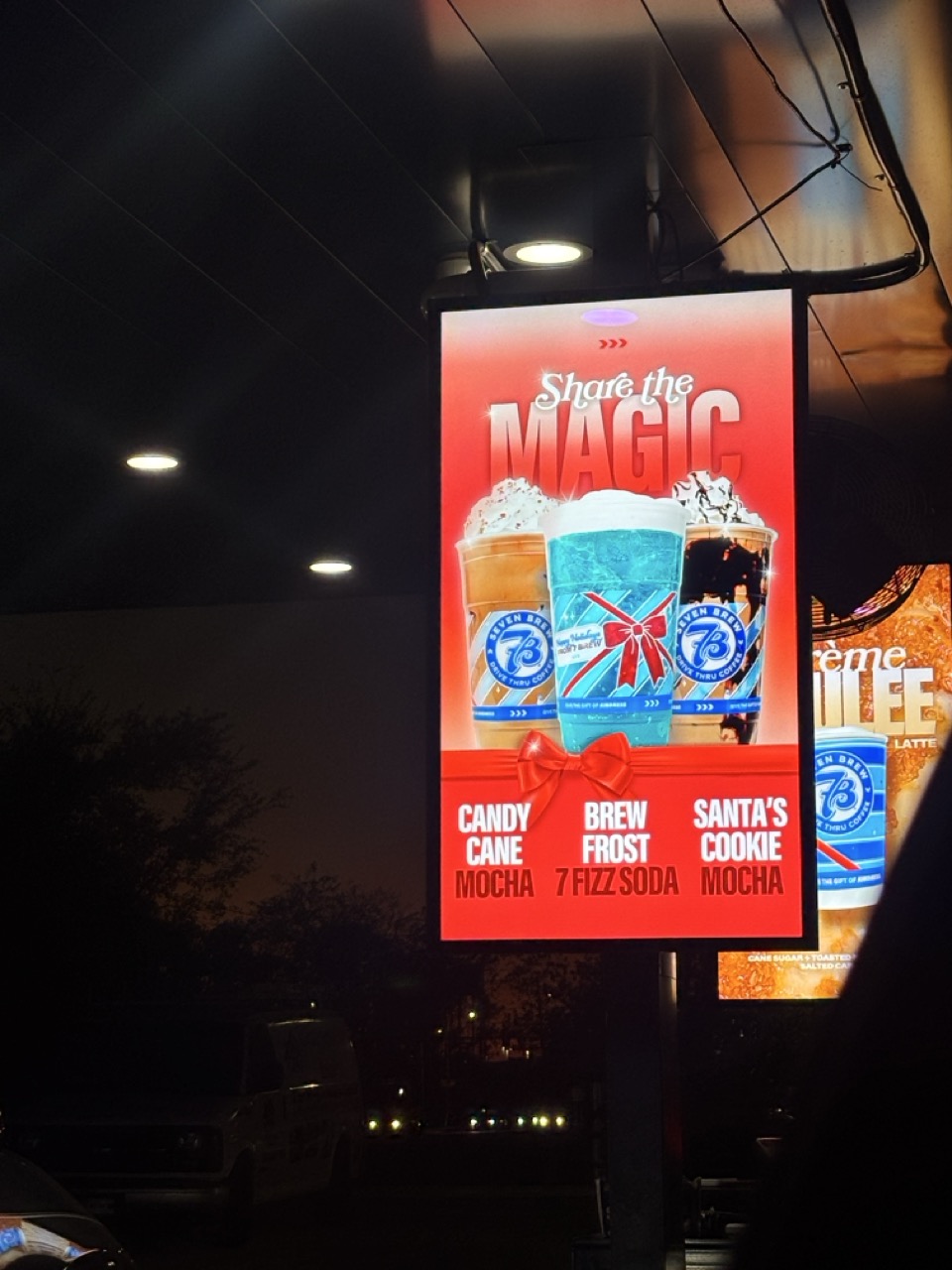 Seven Brew recently came out with a holiday menu, which includes Holiday Punch, 7 Brew Energy, Creme Brulé Latte, Pecan Pie Breve, Candy Cane Mocha, Brew Frost 7 Fizz Soda, and Santa’s Cookie Mocha.
