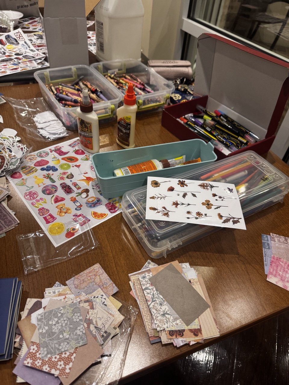 Students who joined found a lot of stationery on the tables, such as decorative tapes, stickers, clippings from magazines and newspapers, and beautiful pieces of paper, featuring backgrounds, patterns, and images, all intended for decorating the covers of their scrapbooks.
